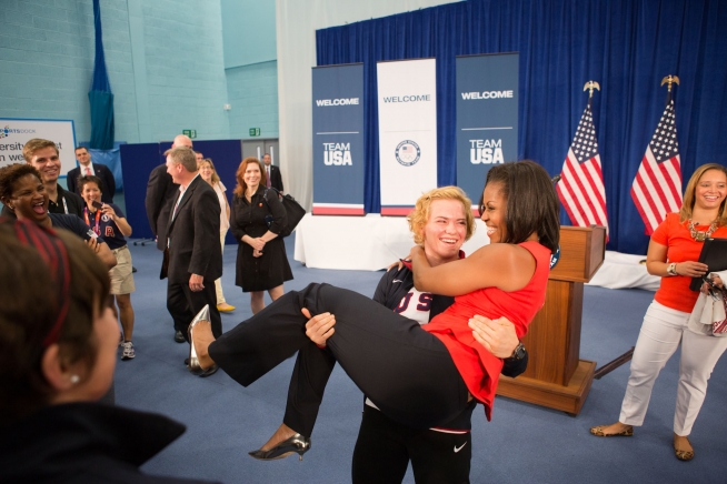 First Lady Michelle Obama is picked up by U.S. Olympic wrestler Elena Pirozhkova during a greet with Team USA Olympic athletes competing in the 2012 Summer Olympic Games, at the U.S. Olympic Training Facility at the University of East London in London, England, July 27, 2012. (Official White House Photo by Sonya N. Hebert)