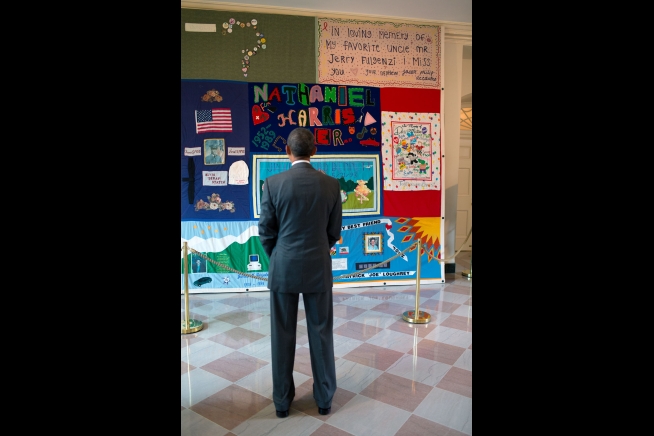 President Barack Obama views a section of the AIDS quilt on display in the Booksellers area of the White House, July 18, 2012.