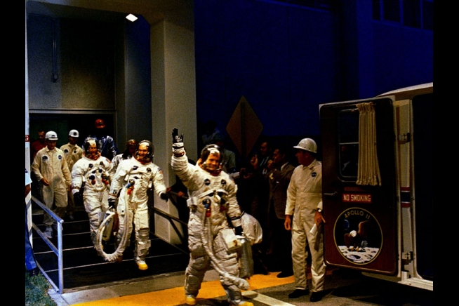 The Apollo 11 crew leaves Kennedy Space Center's Manned Spacecraft Operations Building during the pre-launch countdown. Mission commander Neil Armstrong, command module pilot Michael Collins, and lunar module pilot Buzz Aldrin prepare to ride the special transport van to Launch Complex 39A where their spacecraft awaited them. Liftoff occurred at 9:32 a.m. EDT, July 16, 1969. Image credit: NASA