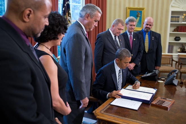 President Barack Obama signs the “Honoring America’s Veterans and Caring for Camp Lejeune Families Act of 2012,” in the Oval Office, Aug. 6, 2012. (Official White House Photo by Pete Souza)