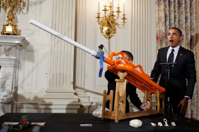President Barack Obama demos Joey Hudy's Extreme Marshmallow Cannon at the second White House Science Fair in the State Dining Room of the White House.