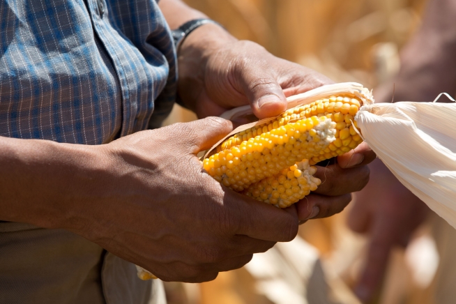 President Barack Obama holds ears of corn during his tour of the McIntosh family farm, which has been affected by the drought, in Missouri Valley, Iowa, Aug. 13, 2012. (Official White House Photo by Pete Souza)