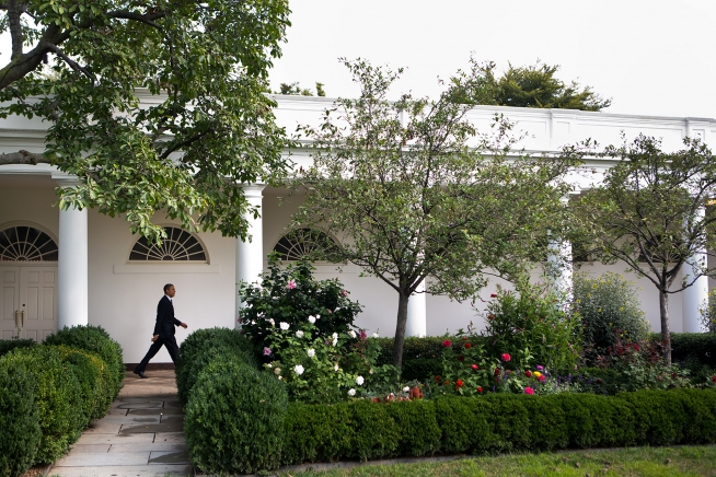 President Barack Obama walks along the Colonnade of the White House en route to the Diplomatic Reception Room, Aug. 28, 2012, to deliver a statement on Tropical Storm Isaac. (Official White House Photo by Lawrence Jackson)