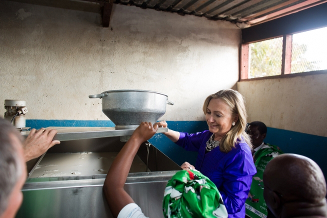 Secretary of State Hillary Rodham Clinton looks at freshly harvested milk being stored for pick up at the Lumbadzi Milk Bulking Group, a community-managed dairy enterprise in Lilongwe, Malawi, Aug. 5, 2012. Secretary Clinton praised the dairy enterprise for its role in increasing the income of small farmers and for helping communities live more nutritiously. (Official White House Photo by Lawrence Jackson)