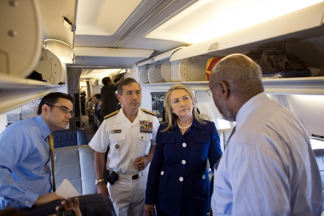 Secretary of State Hillary Rodham Clinton talks with advisors on board her plane in Kampala, Uganda, before taking off for South Sudan, Aug. 3, 2012. Pictured, from left, are: Grant Harris, White House Senior Director for African Affairs; Vice Admiral Harry B. Harris Jr.; and Johnnie Carson, Assistant Secretary of State for African Affairs. (Official White House Photo by Lawrence Jackson)