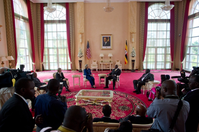 Secretary of State Hillary Rodham Clinton visits with Ugandan President Yoweri Kaguta Museveni at the State House in Kampala, Uganda, Aug. 3, 2012. Secretary Clinton and President Museveni discussed a range of issues including the rise of HIV infections in Uganda, which is the only country in sub-Saharan Africa where the rate is going up instead of down. (Official White House Photo by Lawrence Jackson)