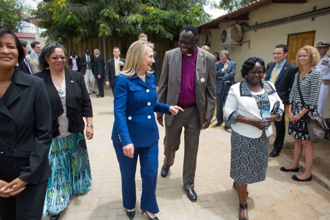 Secretary of State Hillary Rodham Clinton walks with Bishop Elias Taban and his wife, Rev. Anngrace Taban, at the U.S. Embassy in Juba, South Sudan, Aug. 3, 2012. Secretary Clinton flew to South Sudan's capital for a brief visit to offer U.S. support and to encourage progress in negotiations and stress the urgency of ending disputes with Sudan over oil and territory. She became interested in meeting Bishop Taba, a former child soldier and current chaplain for peace and head of the Sudan Evangelical Alliance and the Sudan and Uganda Evangelical Presbyterian Church, after reading an opinion piece in the New York Times authored by Bishop Taban. (Official White House Photo by Lawrence Jackson)