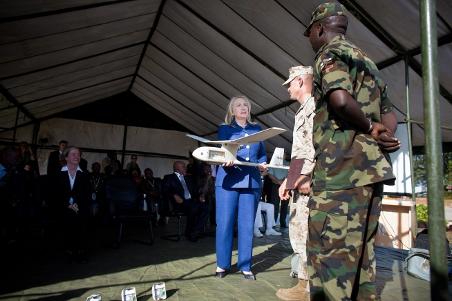 Secretary of State Hillary Rodham Clinton watches a demonstration of drone capabilities by U.S. and Uganda military representatives at Kasenyi Military Base in in Kampala, Uganda, Aug. 3, 2012. The U.S. supplies drones and training to the Ugandan military, which they use in their hunt for Joseph Kony and members of the Lord's Resistance Army, a militant group operating in Uganda and other central African countries. (Official White House Photo by Lawrence Jackson)