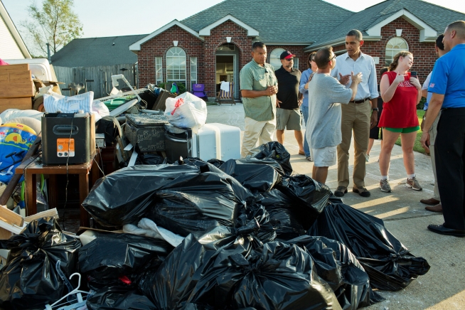 President Barack Obama talks with a resident as he tours a neighborhood in LaPlace, La., with local and federal officials to view damage and the ongoing response and recovery efforts to Hurricane Isaac, Sept. 3, 2012. (Official White House Photo by Pete Souza)