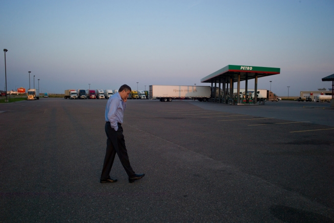 Education Secretary Arne Duncan talks on his phone at a truck stop while traveling between Limon, Colo., and Topeka, Kan., Sept. 17, 2012. (Official White House Photo by Chuck Kennedy)