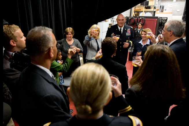 Dr. Jill Biden and General Ray Odierno, Chief of Staff of the Army, make a toast with sparkling cider before the “Operation Educate the Educators” event at George Mason University in Fairfax, Va., Oct. 3, 2012. The event celebrated the 100 colleges and universities that have signed on to the Joining Forces commitment to help prepare educators and develop school cultures that are more responsive to the needs of children in military families. (Official White House Photo by David Lienemann)