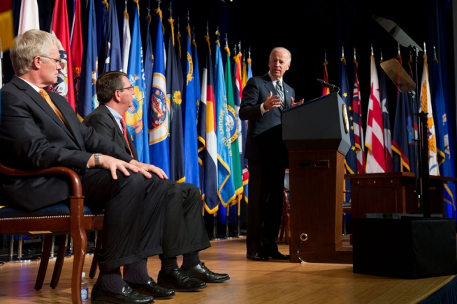 Vice President Joe Biden delivers remarks at an MRAP Program Transition Ceremony at the Pentagon, in Arlington, Virginia, October 1, 2012.