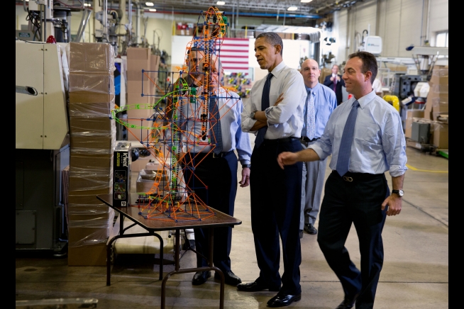 President Barack Obama examines a K'NEX rollercoaster with Michael Araten, President and CEO of K'NEX and Rodon Group, right, during a tour of the company in Hatfield, Pa., Nov. 30, 2012.