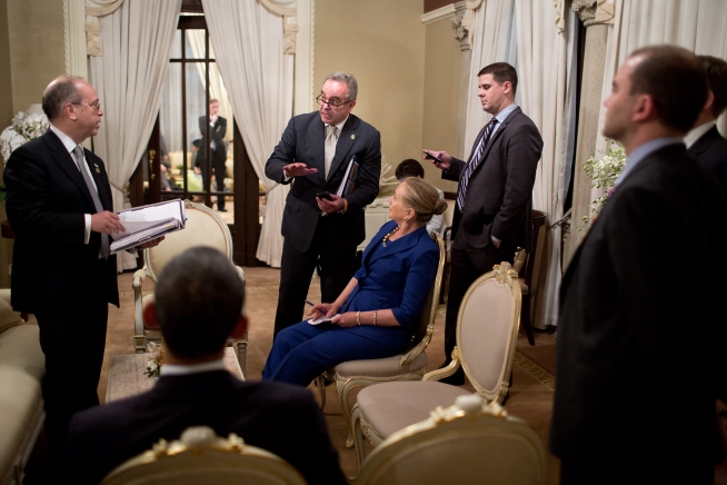 President Barack Obama prepares for a press conference at the Government House in Bangkok, Thailand, Nov. 18, 2012. From left are: Danny Russel, Senior Director for Asian Affairs; Kurt Campbell, Assistant Secretary of State for East Asian and Pacific Affairs; Secretary of State Hillary Rodham Clinton: Director of Communications Dan Pfeiffer; and Ben Rhodes, Deputy National Security Advisor for Strategic Communications. (Official White House Photo by Pete Souza)