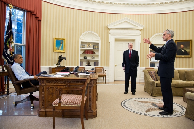 President Barack Obama talks with National Security Advisor Tom Donilon and Deputy National Security Advisor Denis McDonough in the Oval Office, Nov. 16, 2012. (Official White House Photo by Pete Souza)
