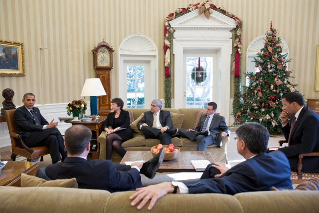 President Barack Obama meets with senior advisors in the Oval Office, Dec. 13, 2012. Pictured, clockwise from the President, are: Senior Advisor Valerie Jarrett; Pete Rouse, Counselor to the President; Senior Advisor David Plouffe; Rob Nabors, Assistant to the President for Legislative Affairs; Chief of Staff Jack Lew; and Director of Communications Dan Pfeiffer. (Official White House Photo by Pete Souza)