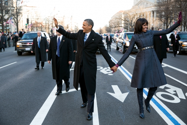 President Barack Obama and First Lady Michelle Obama wave to the crowd as they walk in the inaugural parade along Pennsylvania Avenue in Washington, D.C., Jan. 21, 2013. (Official White House Photo by Pete Souza)