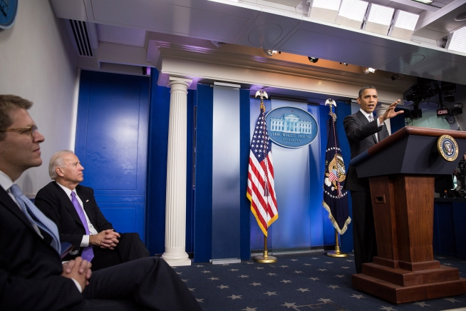 Press Secretary Jay Carney and Vice President Joe Biden listen as President Barack Obama delivers remarks about the Administration’s effort to develop policy proposals in response to the tragedy in Newtown, Conn., in the James S. Brady Press Briefing Room of the White House, Dec. 19, 2012. The President announced the Vice President would lead the effort, involving members of the Cabinet and outside organizations, to develop a set of proposals. (Official White House Photo by Pete Souza)