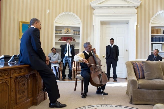 President Barack Obama listens to cellist Khari Joyner, a 21-year-old Make-A-Wish recipient from Atlanta, Ga., in the Oval Office, Jan. 29, 2013.(Official White House Photo by Pete Souza)