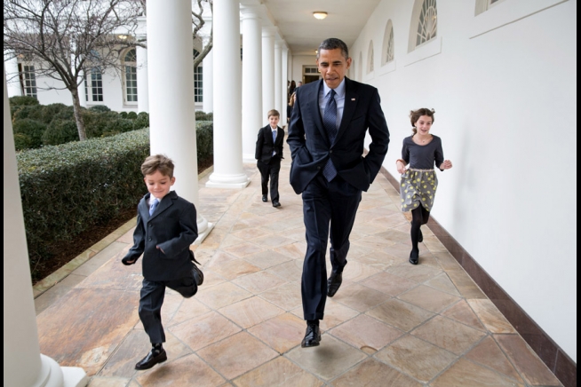 President Barack Obama runs along the Colonnade of the White House with Deputy National Security Advisor Denis McDonough's children, Jan. 25, 2013. The President announced McDonough will become Chief of Staff, replacing Jack Lew, the nominee for Treasury Secretary. (Official White House Photo by Pete Souza)