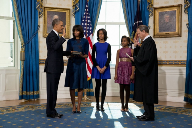 Supreme Court Chief Justice John Roberts administers the oath of office to President Barack Obama during the official swearing-in ceremony in the Blue Room of the White House on Inauguration Day, Sunday, Jan. 20, 2013. First Lady Michelle Obama, holding the Robinson family Bible, along with daughters Malia and Sasha, stand with the President.