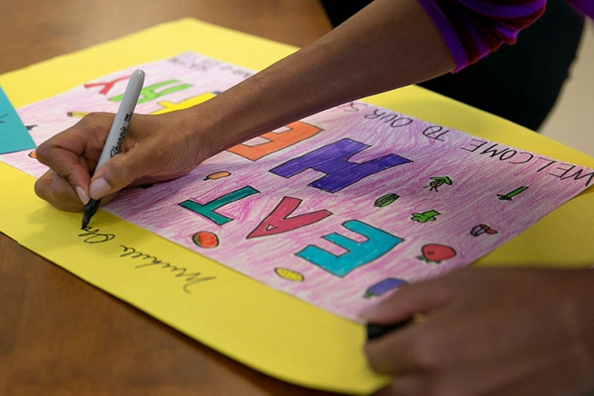 First Lady Michelle Obama signs artwork done by the students of Eastside and Northside Elementary Schools in Clinton, Miss., Feb. 27, 2013. (Official White House Photo by Lawrence Jackson)