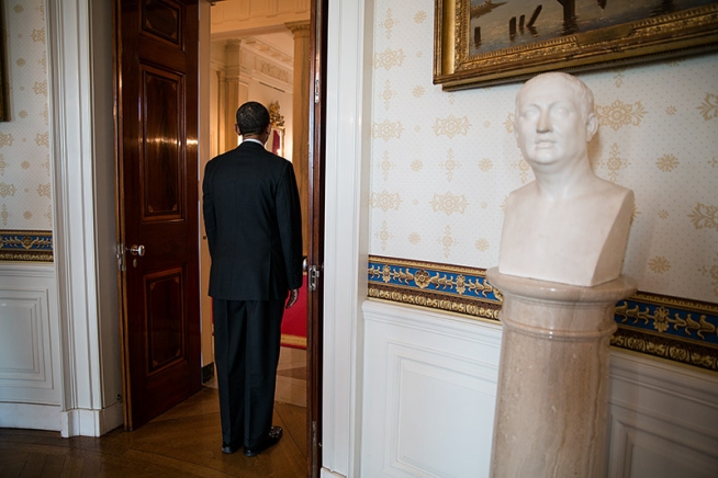 President Barack Obama waits as he is introduced for an event honoring the recipients of the 2011 National Medal of Science and National Medal of Technology and Innovation, in the Blue Room of the White House, Feb. 1, 2013. A bust of Christopher Columbus is seen at right. (Official White House Photo by Pete Souza)