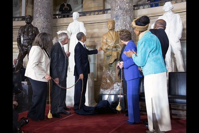 President Barack Obama touches the Rosa Parks statue after the unveiling during a ceremony in Statuary Hall at the U.S. Capitol in Washington, D.C., Feb. 27, 2013. Helping with the unveiling, were, from left: Sheila Keys, niece of Rosa Parks; Majority Leader Sen. Harry Reid, D-Nev.; House Speaker John Boehner, R-Ohio; House Minority Leader Rep. Nancy Pelosi, D-Calif.; Assistant Democratic Leader Rep. James Clyburn, D-S.C.; and Elaine Eason Keys. (Official White House Photo by Chuck Kennedy)