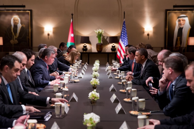 President Barack Obama and King Abdullah II participate in an expanded bilateral meeting at Al Hummar Palace in Amman, Jordan, March 22, 2013. (Official White House Photo by Pete Souza)