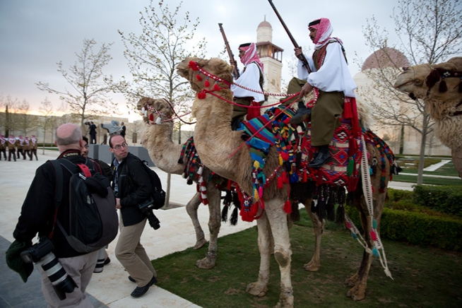 Members of the White House press corps pass in front of Jordanian soldiers mounted on camels during the official arrival ceremony at Al Hummar Palace in Amman, Jordan, March 22, 2013. (Official White House Photo by Chuck Kennedy)