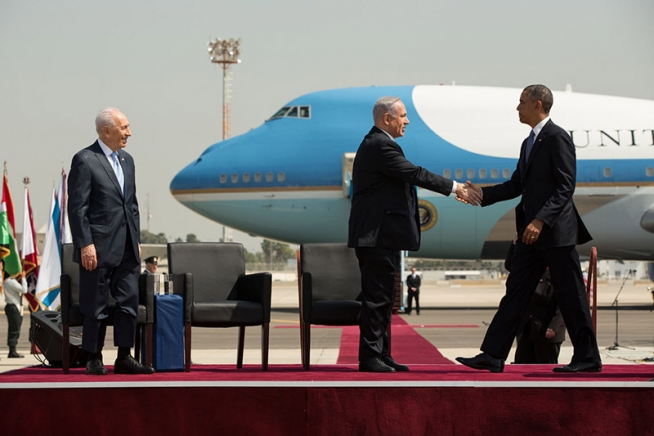 President Barack Obama shakes hands with Israeli Prime Minister Benjamin Netanyahu during the official arrival ceremony at Ben Gurion International Airport in Tel Aviv, Israel, March 20, 2013. Israeli President Shimon Peres stands at left