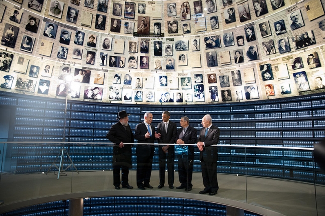 President Barack Obama visits the Hall of Names during his visit to the Yad Vashem Holocaust Museum in Jerusalem, March 22, 2013. Standing with the President, from left, are: Rabbi Yisrael Meir Lau; Israeli Prime Minster Benjamin Netanyahu; Avner Shalev, Chairman of the Yad Vashem Directorate; and Israeli President Shimon Peres.