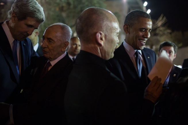 President Barack Obama talks with guests before departing the President’s residence in Jerusalem, March 21, 2013. Secretary of State John Kerry talks with Israeli President Shimon Peres at left. (Official White House Photo by Pete Souza)