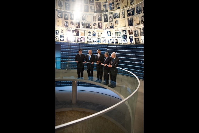 President Barack Obama visits the Hall of Names during his visit to the Yad Vashem Holocaust Museum in Jerusalem, March 22, 2013. Standing with the President, from left, are: Rabbi Yisrael Meir Lau; Israeli Prime Minster Benjamin Netanyahu; Avner Shalev, Chairman of the Yad Vashem Directorate; and Israeli President Shimon Peres. (Official White House Photo by Chuck Kennedy)