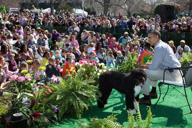 President Barack Obama, with Bo, the Obama family dog, reads to children on the South Lawn during the 2013 White House Easter Egg Roll, April 1, 2013.