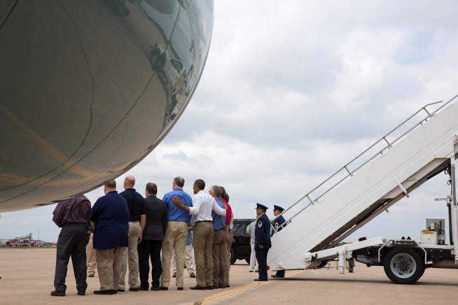 President Barack Obama greets tornado forecasters from NOAA Storm Prediction Center in Norman, Okla., on the tarmac at Tinker Air Force Base in Oklahoma, before his departure, May 26, 2013. (Official White House Photo by Chuck Kennedy)