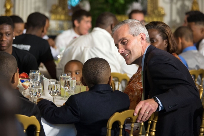 Chief of Staff Denis McDonough talks with a young participant during the Father's Day luncheon in the State Dining Room of the White House, June 14, 2013. (Official White House Photo by Amanda Lucidon)