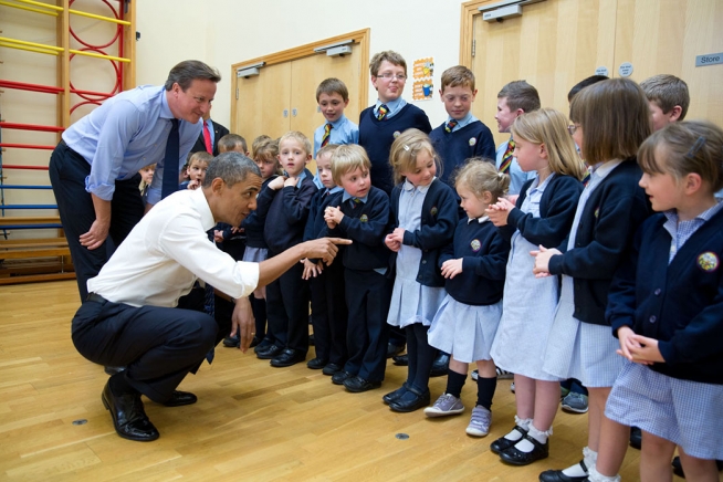 President Barack Obama and British Prime Minister David Cameron visit with school children at Enniskillen Primary School, Enniskillen, Northern Ireland, June 17, 2013. (Official White House Photo by Pete Souza)