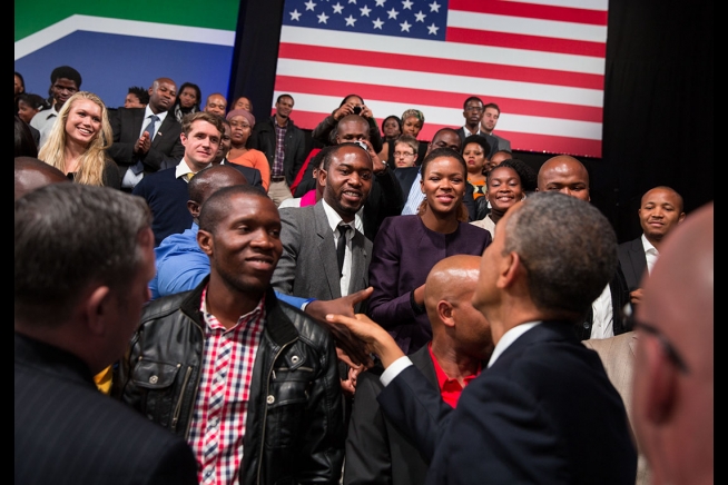President Barack Obama greets audience members during a Young African Leaders Initiative Town Hall at the University of Johannesburg Soweto campus in Johannesburg, South Africa, June 29, 2013.