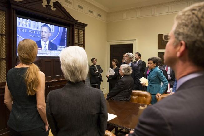 Members of the Cabinet watch as President Obama makes a televised statement on a possible government shutdown, in the Roosevelt Room of the White House, Sept. 30, 2013.