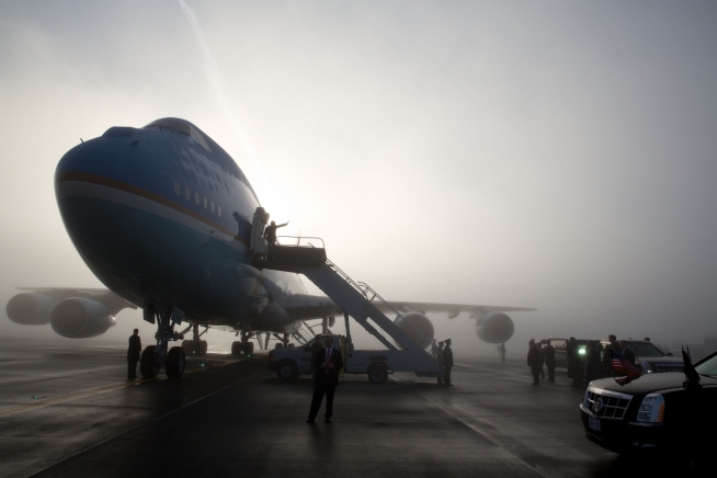 During a foggy morning, President Barack Obama waves from Air Force One as he gets ready to depart Seattle, Wash., Nov. 25, 2013. (Official White House Photo by Pete Souza)