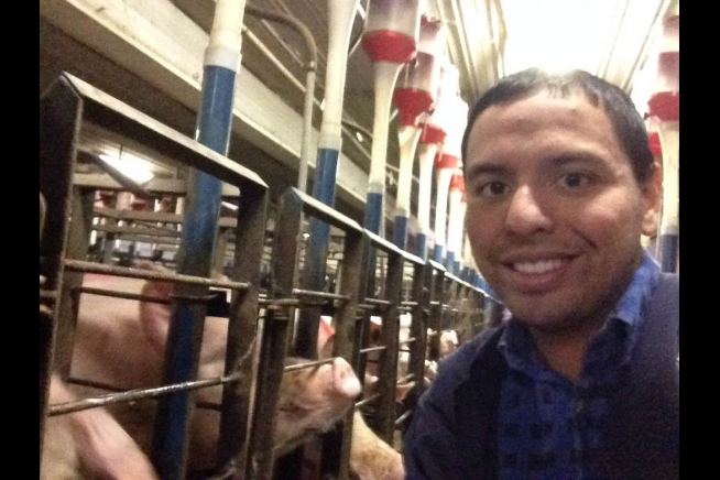 Daniel Oldham, 23, on the North Carolina A&T State University Swine Farm in Greensboro, NC. Oldham is a graduate student who started a company based on a technology that transforms swine manure into a glue adhesive.