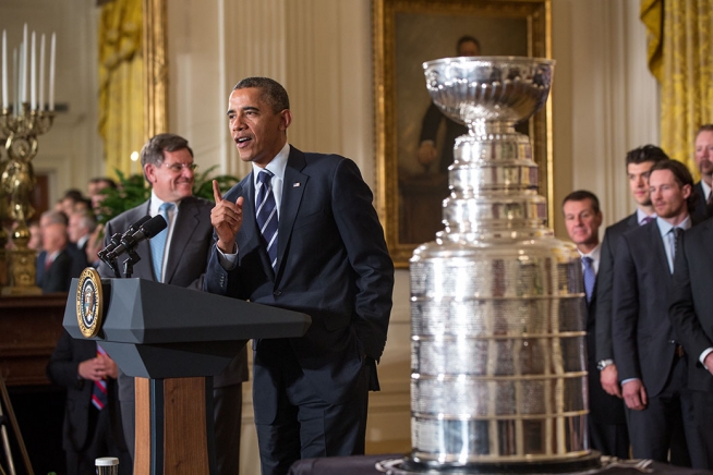 President Barack Obama welcomes the five-time Stanley Cup Champion Chicago Blackhawks to the White House to honor the team and their 2013 Stanley Cup victory, in the East Room of the White House, Nov. 4, 2013. (Official White House Photo by Pete Souza)