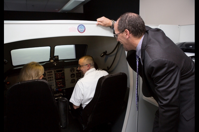 Dr. Biden takes a turn at the helm of one of Broward College’s flight simulators.