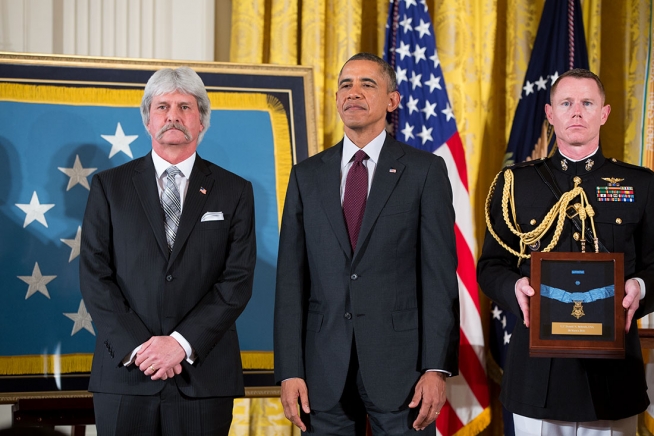 President Barack Obama presents the posthumous Medal of Honor for First Lieutenant Donald K. Schwab during the Medal of Honor ceremony in the East Room of the White House, March 18, 2014. The award is accepted on his behalf by his son Dr. Terry Schwab. (Official White House Photo by Pete Souza)