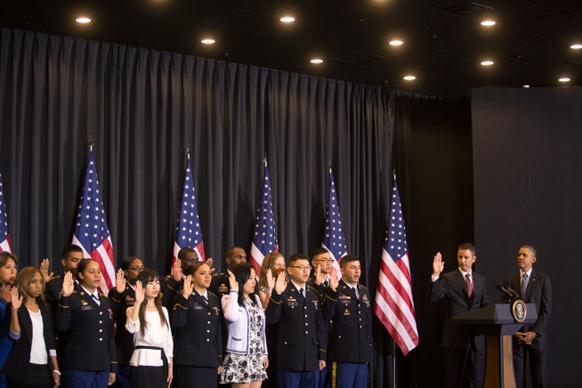 President Barack Obama watches as Robert Daum, Deputy District Director, USCIS Asia-Pacific Region, administers the Oath of Allegiance during a naturalization ceremony at the War Memorial of Korea in Seoul, Republic of Korea, April 25, 2014. (Official White House Photo by Chuck Kennedy)