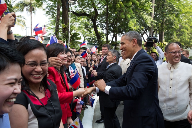 President Barack Obama, with President Benigno S. Aquino III, shakes hands after an arrival ceremony at the Malacañang Palace in Manila, Philippines, April 28, 2014. (Official White House Photo by Pete Souza)