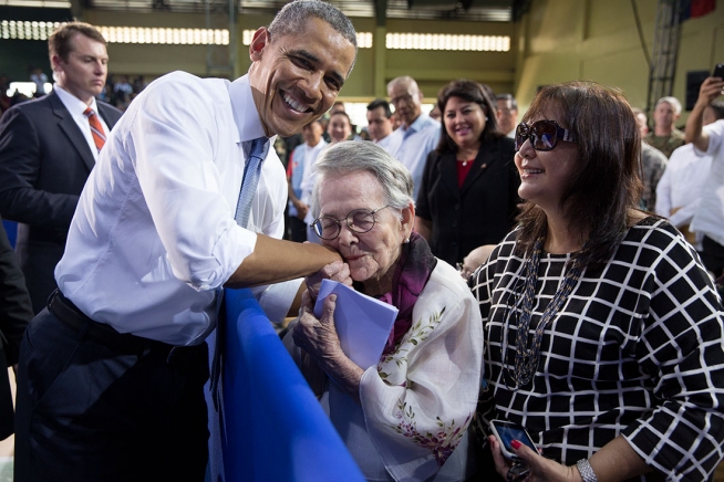 Carolina Garcia Delfin, 94, a Filipina nurse who fought in the resistance against Japanese forces during World War II, kisses President Barack Obama after he mentioned her in his remarks to American and Philippine troops at Fort Bonifacio in Manila, Philippines, April 29, 2014.