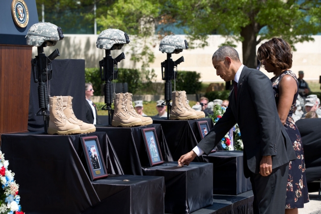President Barack Obama, accompanied by First Lady Michelle Obama, places a presidential coin as they pay their respects during a memorial service for the victims of the Fort Hood shootings, at Fort Hood in Killeen, Texas, April 9, 2014. (Official White House Photo by Pete Souza)