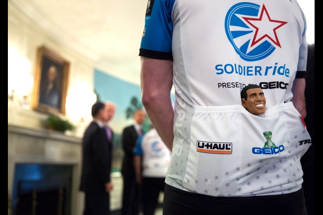 One of the riders taking part in the Wounded Warrior Project's Soldier Ride, with a President Obama bobblehead in his jersey, waits in the Diplomatic Reception Room of the White House, April 17, 2014. (Official White House Photo by David Lienemann)